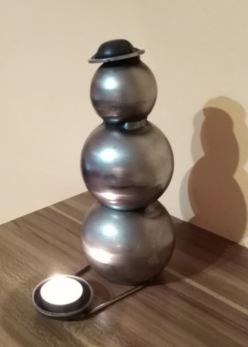 POPIS: Sněhulák z kovových prvků. Před sebou má kalíšek na čajovou svíčku.