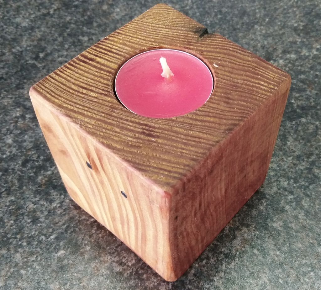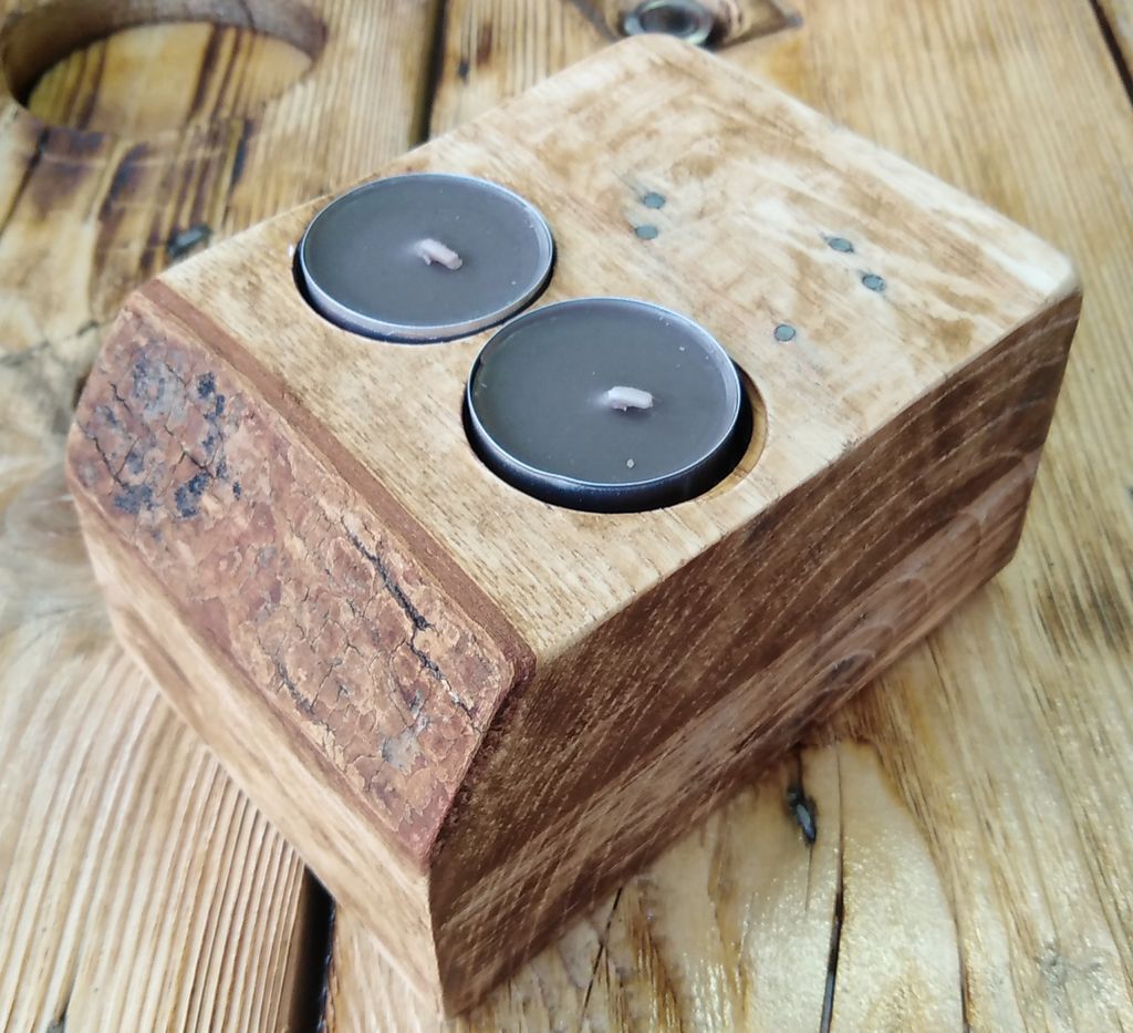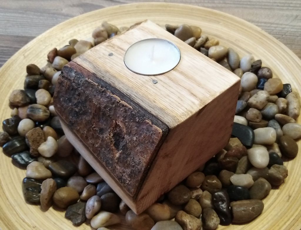 POPIS: Jednoduchý malý svícen v podobě víceméně pravidelné dřevěné kostky v několika variantách: přírodní dekor, opálený plamenem, natřený lazurou nebo barevný (barevný je opálený + natřený barvou). Všechny svícny jsou na závěr natřeny ochranným olejem. Místo pro 1 svíčku. Ruční výroba!